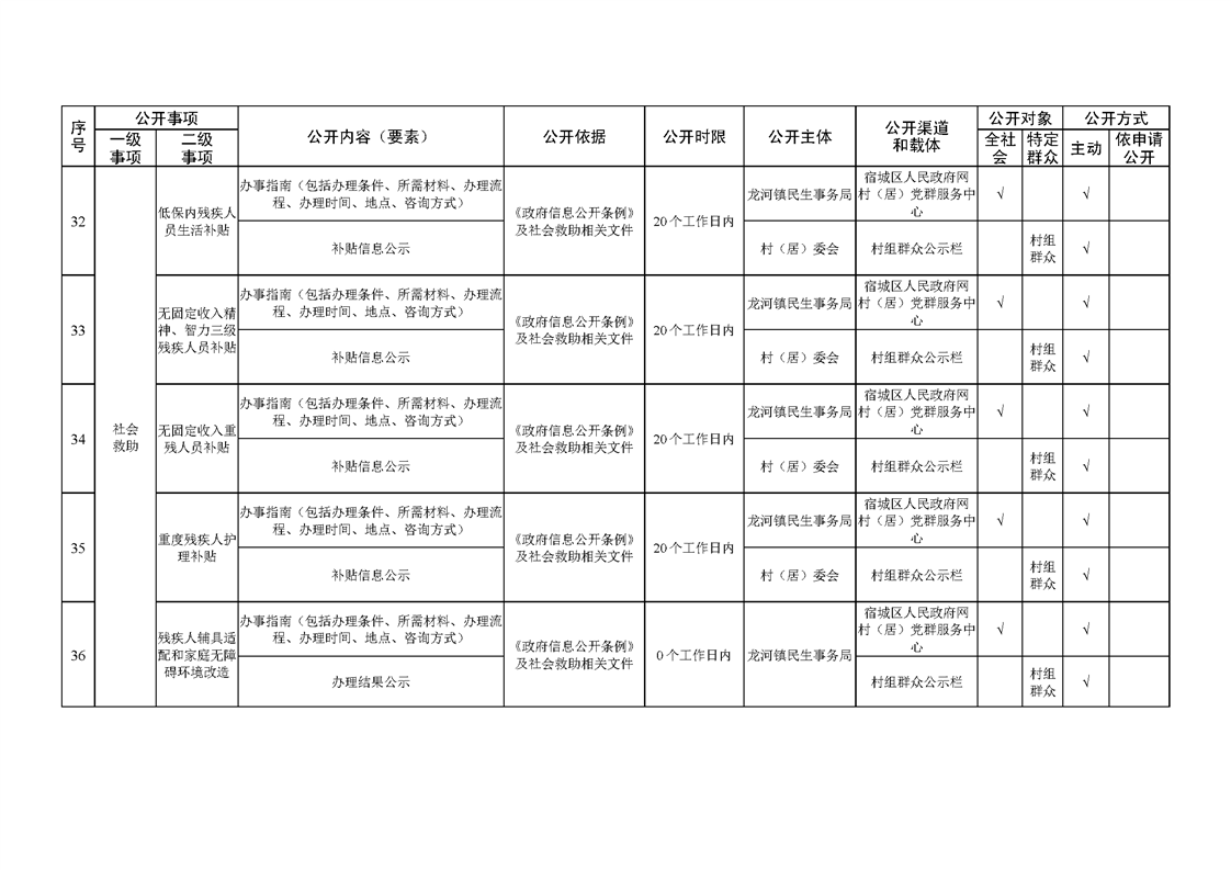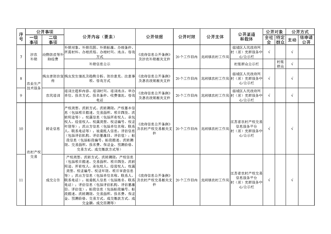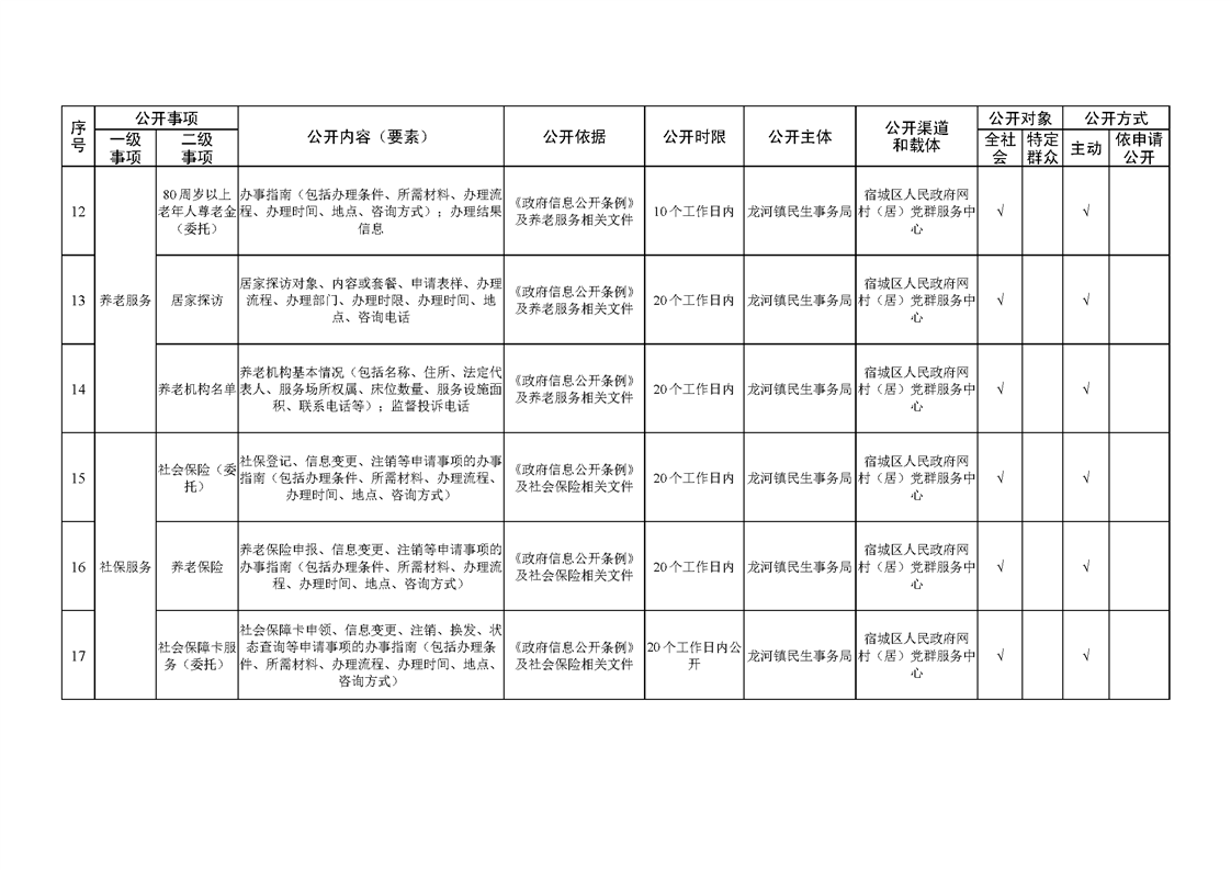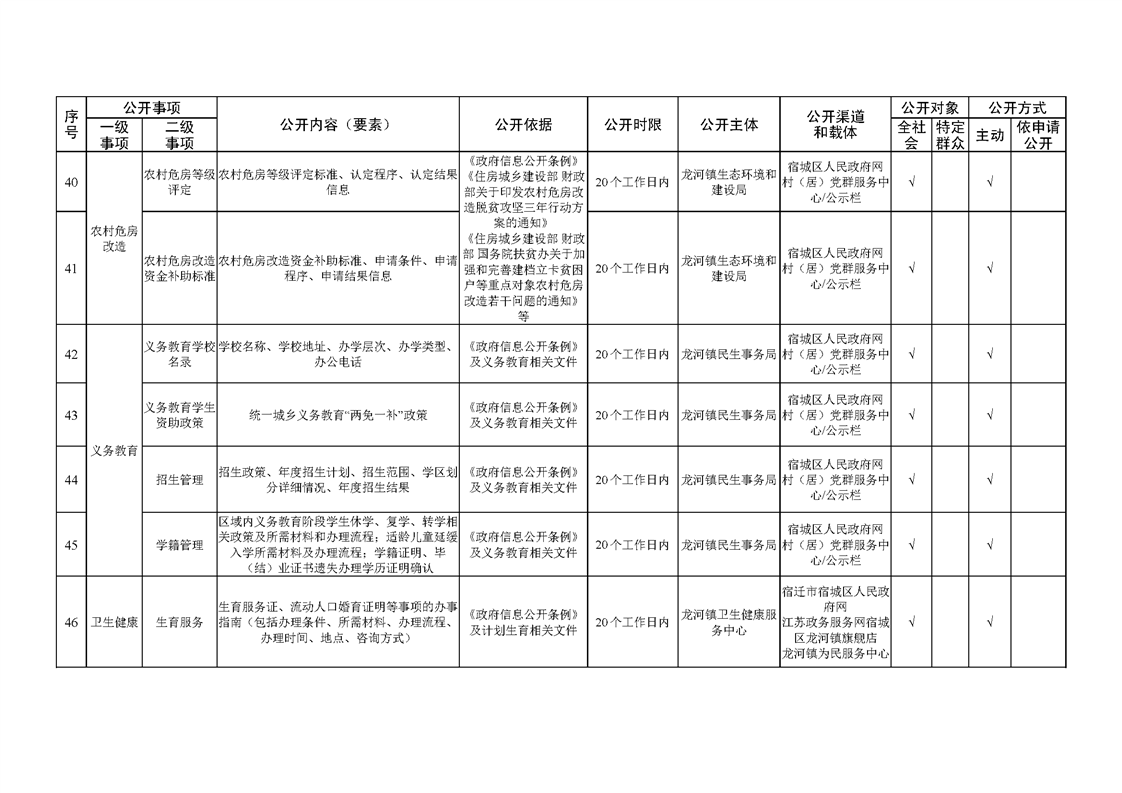 宿城區龍河鎮面向村居基層政務公開標準目錄(2022版)