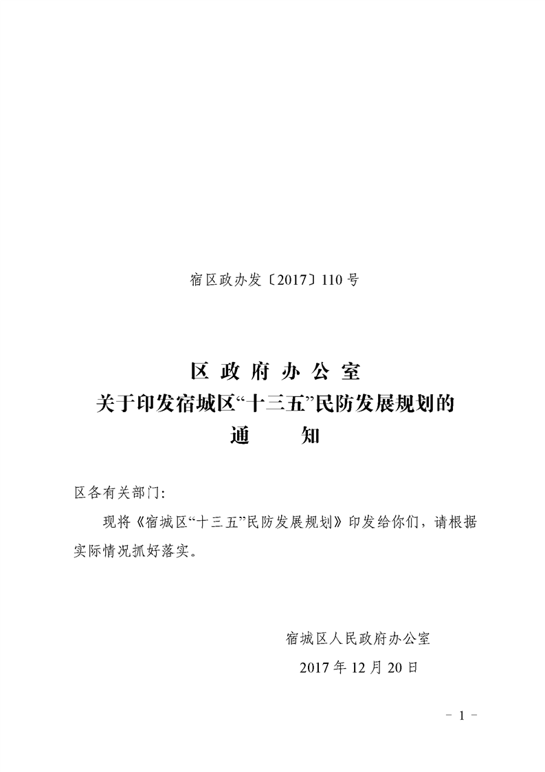 名稱(chēng) 【“十三五”專(zhuān)項(xiàng)規(guī)劃】區(qū)政府辦公室關(guān)于印發(fā)宿城區(qū)“十三五”民防發(fā)展規(guī)劃的通知