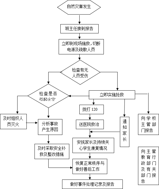 凡危害人類生命財產和生存條件的各類事件通稱之為災害。災害的發生原因主要有二個:一是自然變異,二是人為影響。通常把以自然變異為主因產生的災害稱之為自然災害,如地震、雷擊、臺風等;將以人為影響為主因產生的災害則稱之為人為災害,如人為引起的火災和交通事故。當發生自然災害時,班主任要按照職責處理有關事故事宜。見圖11-3。