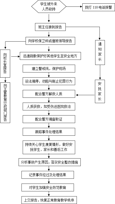 5.警方趕到后,班主任要協同各部門積極配合警方解救人質。人質獲救后,如有受傷,班主任、家長要陪同學生到醫院救治,并積極配合警方開展調查取證工作,學校、班主任除隨時跟蹤事件處理情況外,還要持續關心學生復原情形,做好安撫學生、家長和相關善后工作(注意:必要時可請心理醫生為學生做心理健康恢復治療),及時分析事故產生原因和落實各項整改措施,做好事件處理記錄和報告,加強對學生進行安全防范教育,盡快恢復學校正常的教育教學秩序。