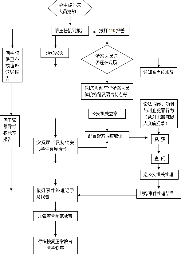 1.當外來人員到校對學生實施搶劫時,獲得事件信息的任何人都要在第一時間向學校保衛科或值班領導,班主任報告,并撥打110電話報警。