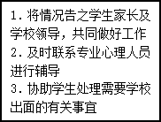 6.如有學生受到傷害,班主任要做好安撫工作,及時開導,盡量穩住家長、學生情緒(包括班上其他學生),持續關心受傷學生康復情況,協助學校做好相關的善后工作。