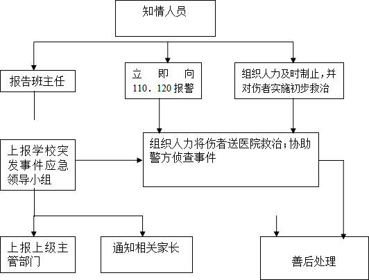 2.班主任接到報告后,要立即趕到現場,協同警戒保衛組建立警戒線,保護好現場,組織其他老師一起迅速疏散保護好其他學生到安全的地方,避免意外事故發生而增大危害范圍,同時向校長室報告和撥打110電話報警,學校進入全面應急狀態。