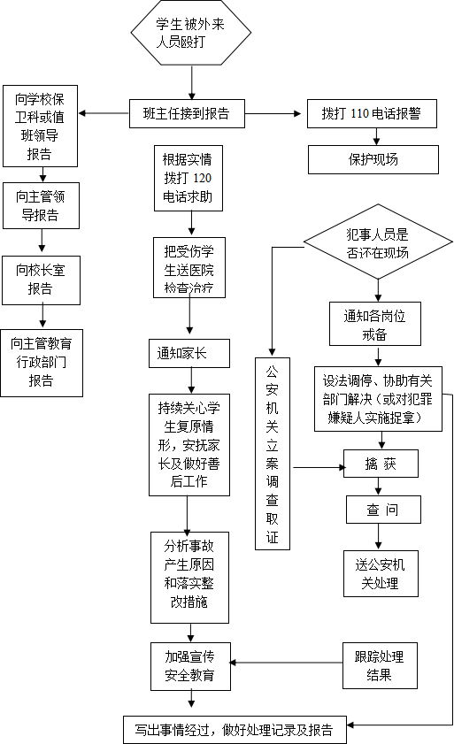 1.外來人員到校毆打學生,知情的任何人都應當注意保護現場,同時在第一時間向班主任、學校保衛科或值班領導報告。