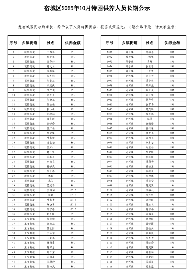 宿城區(qū)2025年10月特困供養(yǎng)人員長(zhǎng)期公示