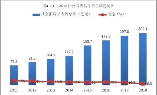 國內消費市場穩中趨緩。2018年,全區實現社會消費品零售總額209.10億元,同比增長6.3%,增速較去年同期回落4.4個百分點。其中,限額以上單位實現社會消費品零售總額72.95億元,同比增長0.1%,增速較去年同期回落4.9個百分點。分城鄉看,城鎮市場占主導地位,農村市場增速快于城鎮。2018年,全區城鎮市場實現限上零售額72.66億元,占全區市總量的99.6%,同比下降1.0%;鄉村市場實現限上零售額0.29億元,占全區總量的0.4%,同比增長1.8%,增速比城鎮市場高2.8個百分點。分行業看,批零業占主導,但拉動不足。2018年,全區限上批發零售業實現零售總額68.75億元,占限上社零總額的94.2%,同比下降1.2%;全區限上住餐業實現零售額4.2億元,同比增長2.3%。