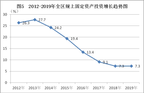 固定資產投資總體平穩。2019年,全區規模以上固定資產投資同比增長7.3%。從產業看:一、二、三產業投資分別占全部投資的1.0%、21.7%、77.3%,同比分別增長40.5個百分點、下降8.8個百分點和增長46.3個百分點;從規??矗?/font>5000萬元以上項目投資同比增長9.6%,500-5000萬元項目投資同比下降83.3%。從結構看:工業投資同比下降8.8%,基礎設施投資同比增長12.9%,房地產開發投資同比增長52.4%。
