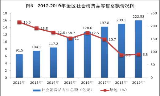 國內消費運行平穩。2019年,全區實現社會消費品零售總額222.58億元,同比增長6.5%,增速較去年同期回升0.2個百分點。其中,限額以上單位實現社會消費品零售總額77.82億元,同比增長3.9%,增速較去年同期回升3.8個百分點。