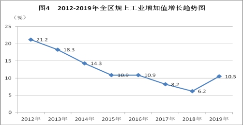 規上工業生產持續增長。2019年,全區規上工業實現總產值184.5億元,同比增長12.3%;實現增加值42.16億元,同比增長10.5%。從6月份開始,產值和增加值均保持兩位數增長。實現主營業務收入217.02億元,同比增長5.9%。