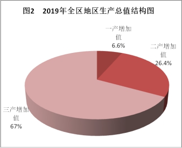 產業結構進一步優化。全區三次產業結構為6.6:26.4:67。其中,第一產業增加值比重比上年下降0.3個百分點,第二產業增加值比重與上年持平,第三產業增加值比重比上年上升0.3個百分點。二、三產業增加值占GDP比重達到93.4%,比上年增0.3個百分點。