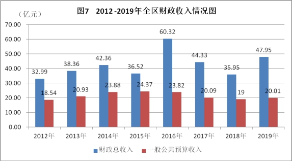 財政收支增長較快。2019年,全區實現財政總收入479468萬元,同比增長33.4%。其中完成一般公共預算收入200061萬元,同比增長5.3%;政府性基金收入172434萬元,同比增長158.3%;中央級收入106915萬元,同比增長4.4%。一般公共預算收入中稅收占比82.4%。