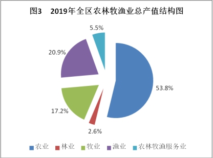 農業生產平穩增長。2019年,全區農林牧漁業總產值41.7億元,同比增長5.3%(現價)。其中,農業22.47億元,林業1.08億元,牧業7.16億元,漁業8.70億元,農林牧漁服務業2.29億元,占比分別為53.8%、2.6%、17.2%、20.9%和5.5%。實現農業增加值26.41億元,按可比價計算增長3%。