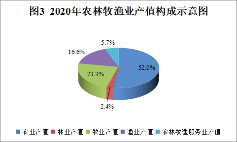 農業生產穩步增長。2020年宿城區實現農林牧漁業總產值45.72億元,可比價增長3.2%。其中,農業產值23.76億元,林業產值1.11億元,牧業產值10.65億元,漁業7.59億元,農林牧漁服務業產值2.61億元,占比分別為52.0%、2.4%、23.3%、16.6%和5.7%。實現農林牧漁業增加值28.99億元,可比價增長2.5%。