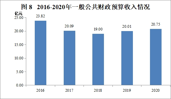 財政收入穩定增長。2020年完成一般公共預算收入20.75億元,比上年增長3.7%。其中,稅收收入18.47億元,比上年增長12.1%;稅收占一般公共預算收入比重達89%,比上年提高6.6個百分點。