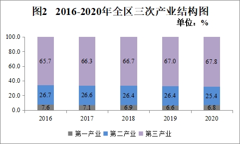 產業結構進一步優化。全區三次產業結構為6.8:25.4:67.8。其中,第一產業增加值比重比上年上升0.2個百分點,第二產業增加值比重比去年下降1.0個百分點,第三產業增加值比重比去年上升0.8個百分點。