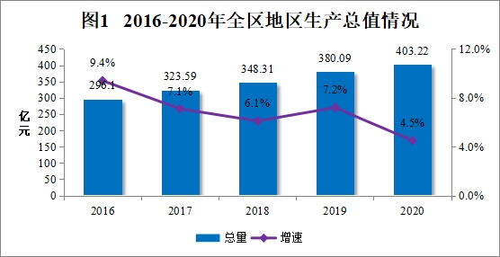 經濟總量繼續擴大。全區實現地區生產總值403.22億元,按可比價格計算,同比增長4.5%。其中,第一產業增加值27.53億元,同比增長2.2%;第二產業增加值102.37億元,同比增長3.8%,其中工業增加值79.09億元,同比增長4.1%;第三產業增加值273.32億元,同比增長5.0%。