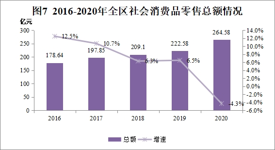 社會消費品市場穩步復蘇。全區累計實現社會消費品零售總額264.58億元,同比下降4.3%,增速較上年同期回落10.8個百分點。其中,限上單位實現社會消費品零售總額106.17億元,同比下降6.0%;限下單位實現社會消費品零售總額158.41億元,同比下降3.1%。