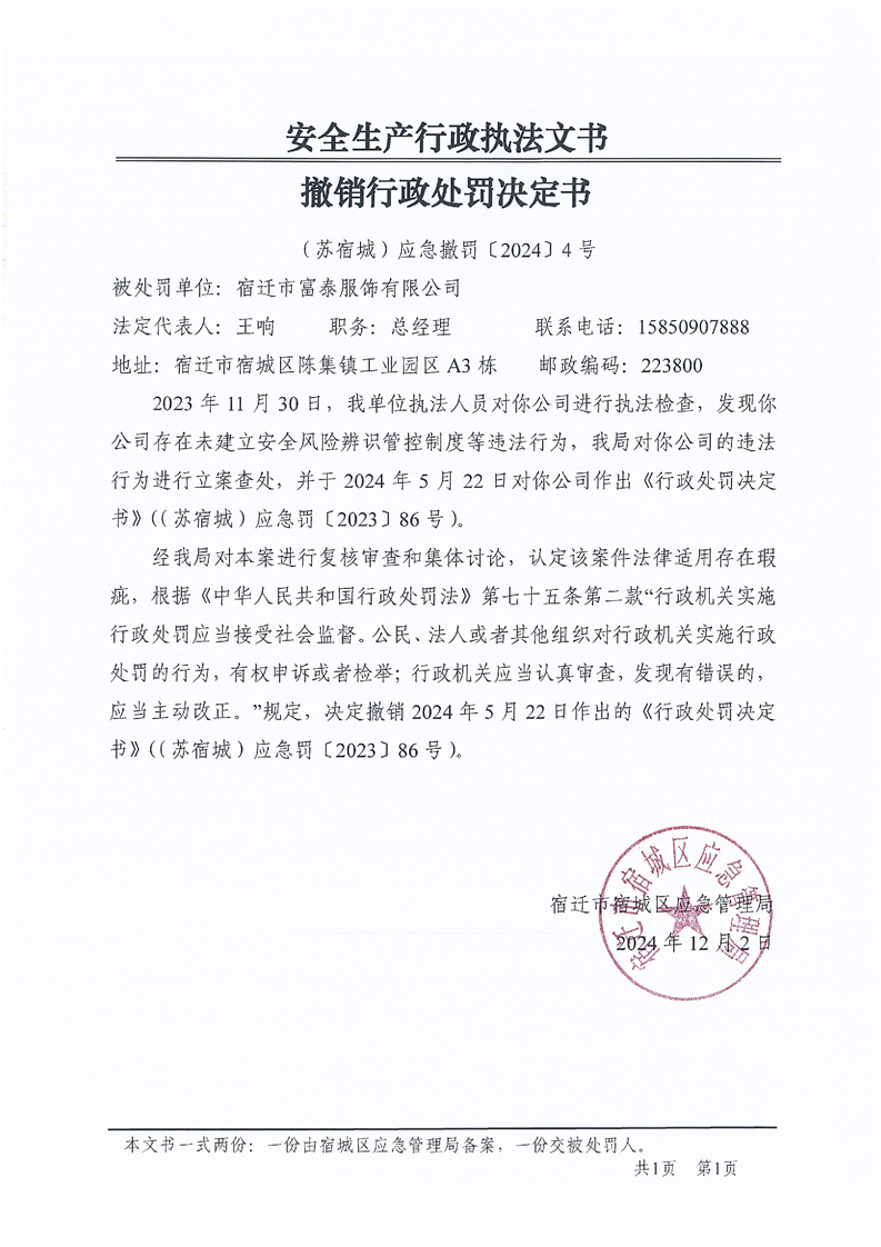 關(guān)于撤銷宿遷市富泰服飾有限公司行政處罰決定書的公告