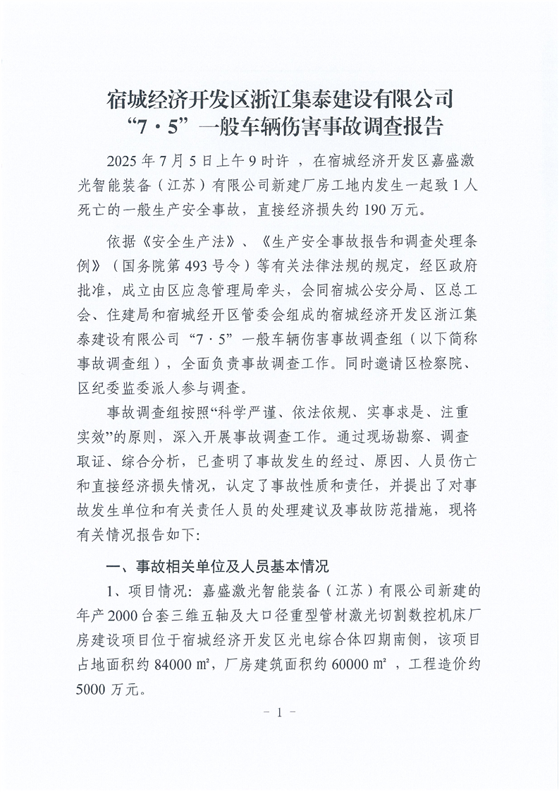 宿城經濟開發區浙江集泰建設有限公司“7·5”一般車輛傷害事故調查報告