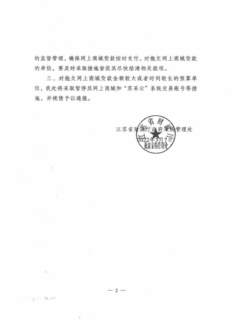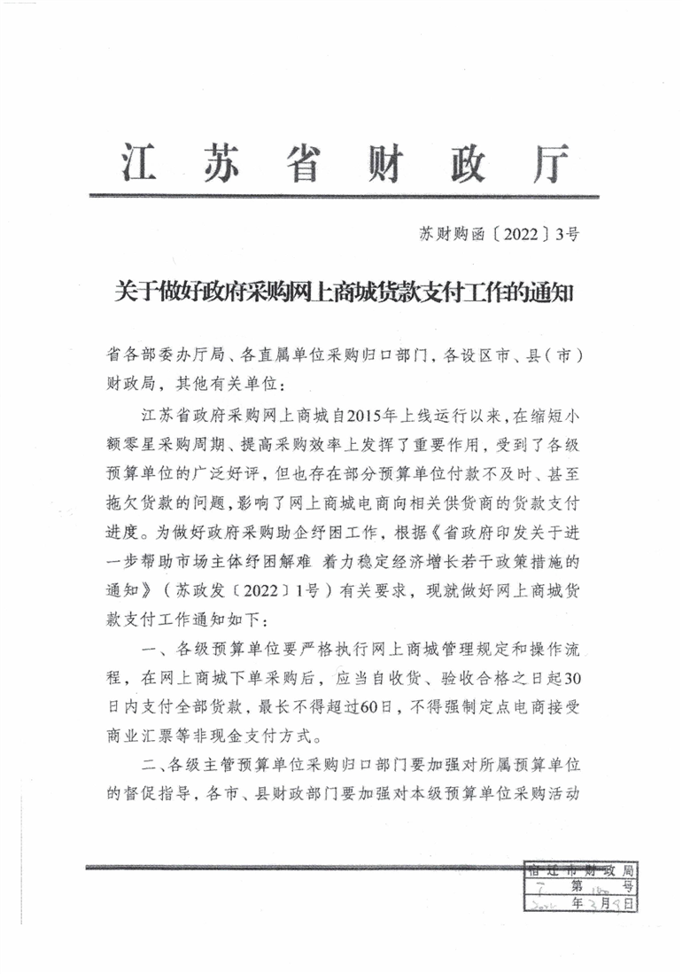 轉發江蘇省財政廳關于做好政府采購網上商城貨款支付工作的通知