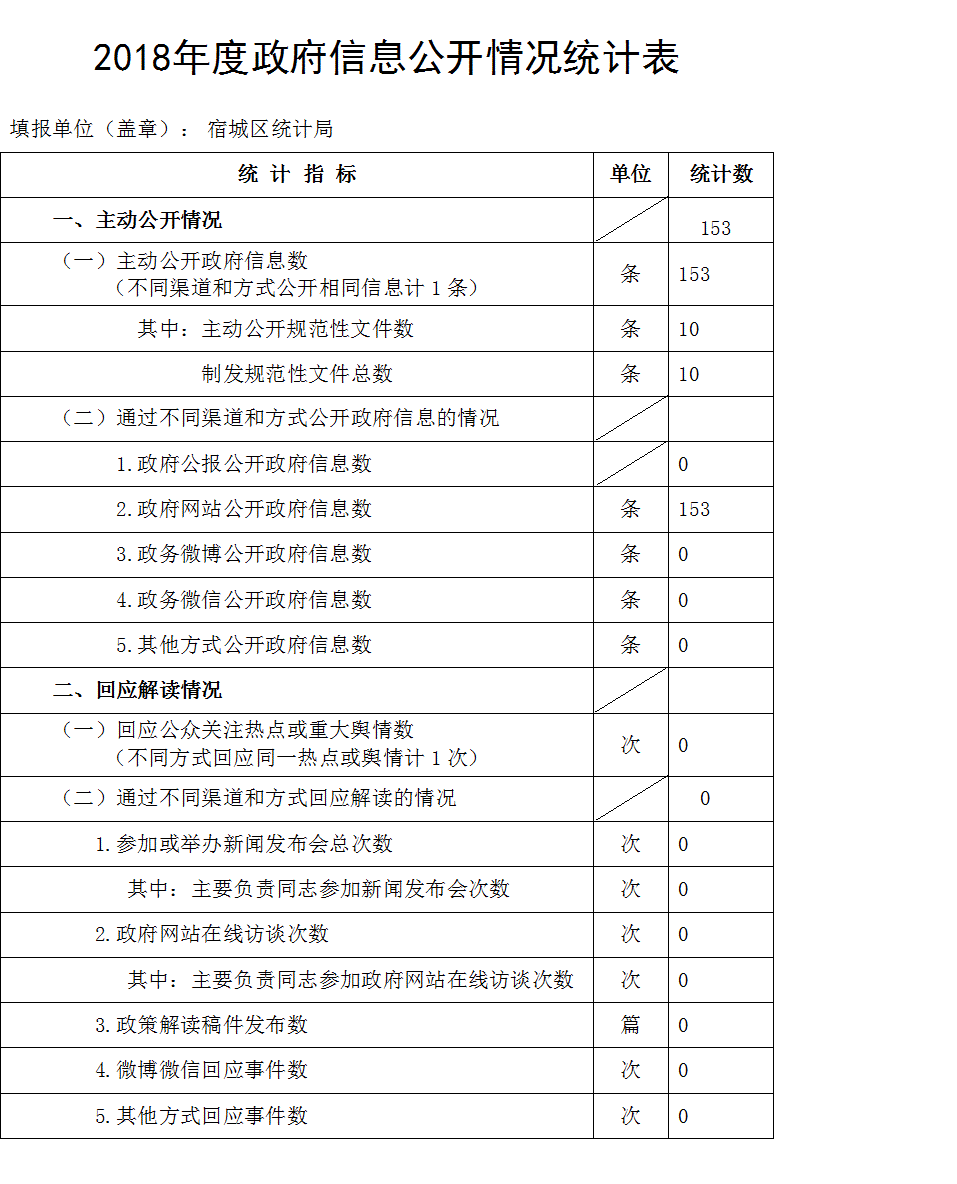 根據《中華人民共和國政府信息公開條例》(以下簡稱《條例》)的規定,特向社會公布2018年宿城區統計局信息公開年度報告。本年報所列數據的統計期限自2018年1月1日起至2018年12月31日止。本報告通過宿城區政府信息公開網公布。如對報告有任何疑問,請與宿城區統計局辦公室聯系(聯系電話:0527-82960292;郵政編碼:223800;電子郵箱:scqtjj825@126.com)。